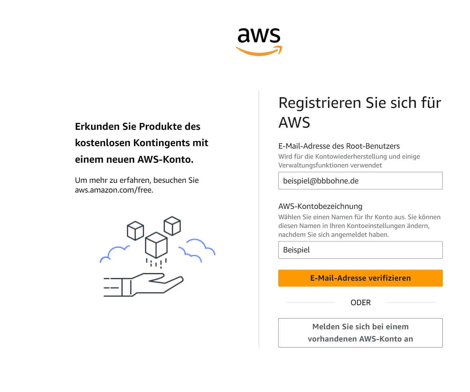 Ganz einfach. Man soll sich beim ersten Mal bei aws registrieren. Unten ist der Screenshot von einem Beispiel.